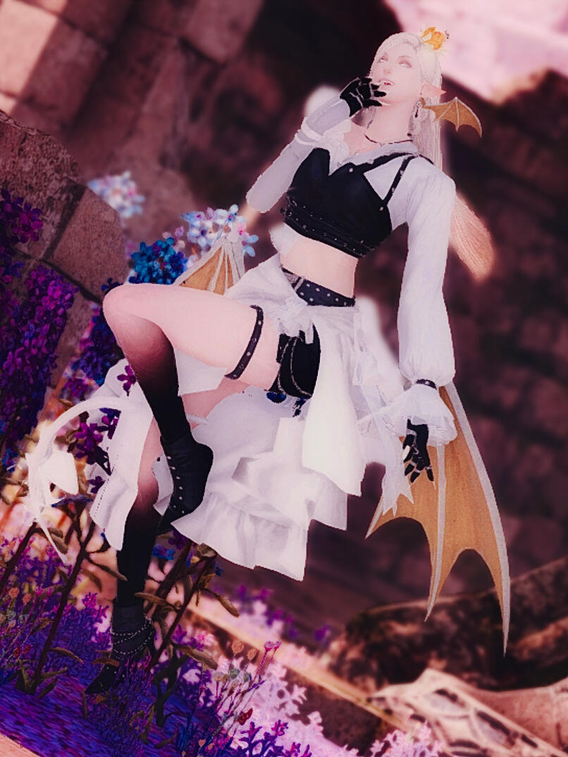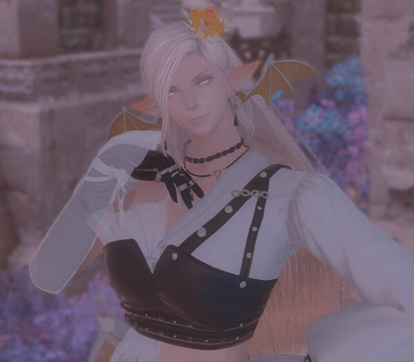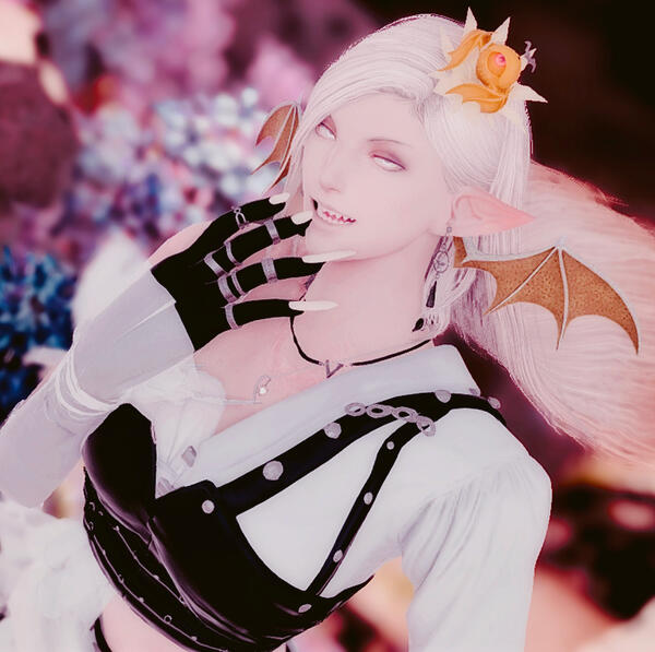 hairpale with blond-stained tips.eyewhite with limbal ring that will change either pink or yellow ..or radiate both! [When averting gaze, she will only cover one eye]teethsharp. all of them. If you want her to bite, she will do it.clawslong nails with pastel-yellow polish. Oh! and right-hand has girlfiend nails~skinblack-dipped limbs and raised skin decor..little remnants of her ahriman body!chestbiiiig soooooft bosom.taillong, gray imp-shaped β‘ with a white ribbon at the end.wingssmall ones behind her elezen-ear glamour and larger ones that protrude from her lower back. Less-often she has the larger ones out.flowera pale yellow "Queen of Night" with a small budd-y nestled on top. Yes, they're watching.